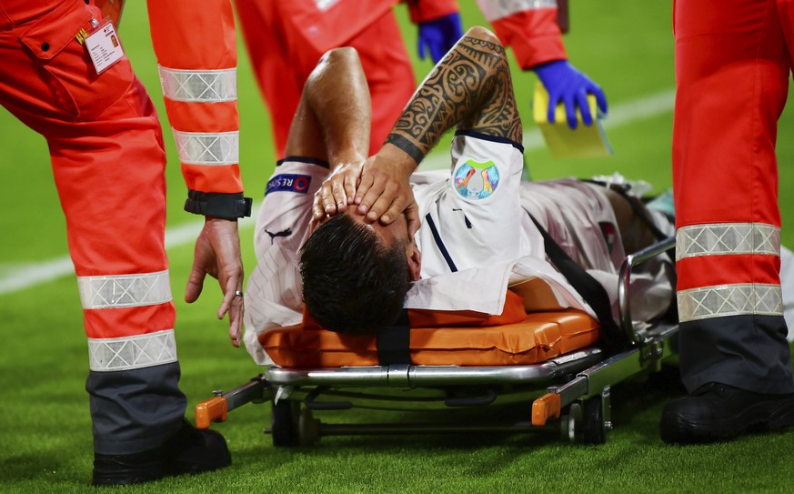 Spinazzola hält sich die hände vors gesicht, wird nach seiner verletzung mit der trage vom platz gebrachtfoto: